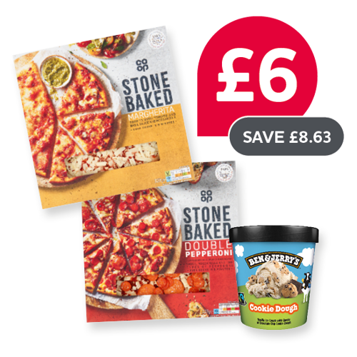 Co-op Stonebaked Pepperoni Pizza / Co-op Stonebaked Margherita / Ben & Jerrys Spectaculove / Ben & Jerrys Sunny Honey Home / Ben & Jerrys Karamel Sutra / Ben & Jerrys Caramel Chew Chew / Ben & Jerrys Phish Food / Ben & Jerrys Half Baked / Ben & Jerrys Choco Fudge Brownie / Ben & Jerrys Cookie Dough