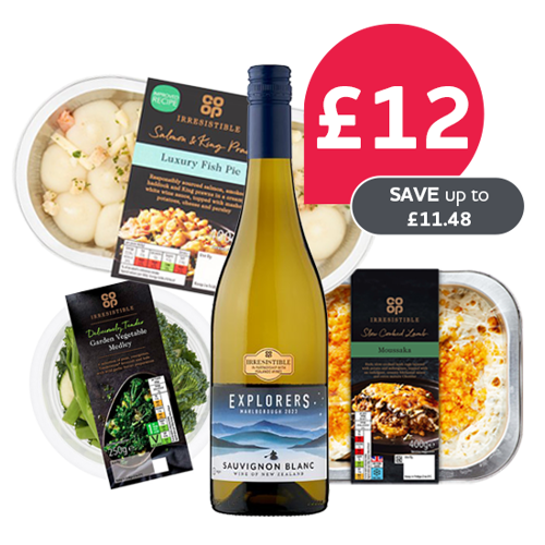 Co-op Irresistible Mushroom Risotto / Co-op Irresistible Lamb Moussaka / Co-op Irresistible Tikka & Rice / Co-op Irresistible Ham Gratin / Co-op Irresistible Beef Pappardelle / Co-op Irresistible Single Serve Salami Calabrese Pizza / Co-op Irresistible Extra Virgin Olive Oil Roast Garlic & Parsley Flatbread / Co-op Irresistible Single Serve Margherita Pizza / Co-op Irresistible Extra Virgin Olive Oil Garlic & Parsley Ciabatta / Co-op Irresistible Chicken Leek & Smoked Ham Hock Pie / Co-op Irresistible Steak & Ale Pie / Co-op Irresistible Paella / Co-op Irresistible Macaroni Cheese / Co-op Irresistible Lasagne Al Forno / Co-op Irresistible Fish Pie / Co-op Irresistible Cottage Pie / Co-op Irresistible Mashed Potato / Co-op Irresistible Triple Cooked Thick Cut Chunky Chips / Co-op Irresistible Veg Steamer 250g / Co-op Irresistible Rioja Crianza / Co-op Irresistible Solo Pale Spanish Rose 13.5% / Co-op Irresistible Explorers Sauv Blanc 12.5% / Coke Zero 4pk / Coke Diet 4pk.