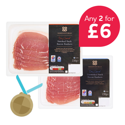 Co-op Irresistible British Dry Cured Smoked Bacon / Co-op Irresistible British Dry Cured Unsmoked Back Bacon