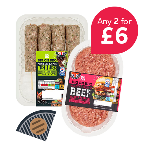 Co-op Irresistible Pork Sausages / Co-op Irresistible Lincolnshire Sausages / Co-op British Quarter Pounder Burgers 4 Pack / Co-op Irresistible Smoky Pulled Pork Burger With Apple / Co-op Irresistible Pork & Onion Sausages / Co-op Irresistible Pork & Apple Sausages / Co-op Irresistible Pork Chipolata Sausages / Co-op Irresistible Cumberland Sausages / Co-op Sweet Chilli Kebabs / Co-op British Mint Lamb Kebab / Co-op British Sweet & Smoky BBQ Beef Kebabs / Co-op Garlic & Herb Sizzle Steak / Co-op Cajun Mini Fillets 300g / Co-op Smoky BBQ Drums.