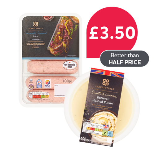 Co-op Irresistible Triple Cooked Thick Cut Chunky Chips / Co-op Irresistible Mashed Potato / Co-op Irresistible Pork Sausages / Co-op Irresistible Cumberland Sausages