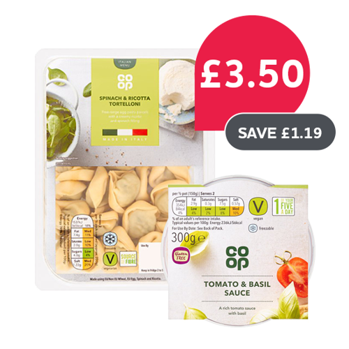 Co-op Spinach & Ricotta Tortelloni / Co-op Chicken & Pancetta Tortelloni / Co-op Four Cheese Tortelloni / Co-op Cheese & Chorizo Tortelloni / Co-op Carbonara Pasta Sauce / Co-op Tomato & Mascarpone Pasta Sauce / Co-op Fresh Tomato & Basil Pasta Sauce / Co-op Arrabiata Pasta Sauce