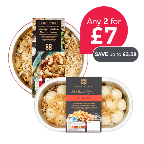 Co-op Irresistible Macaroni Cheese / Co-op Irresistible Mushroom Risotto / Co-op Irresistible Lamb Moussaka / Co-op Irresistible Fish Pie / Co-op Irresistible Ham Gratin / Co-op Irresistible Beef Pappardelle / Co-op Irresistible Lasagne Al Forno / Co-op Irresistible Paella / Co-op Irresistible Cottage Pie / Co Op Irresistible Tikka & Rice.