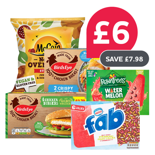 Birds Eye 2 Crispy Chicken / Birds Eye 4 Chicken Burger / Mccain Naked Oven Chips / Nestle Rowntree Watermelon Lollies 4pk / Nestle Fab Lollies 6pk