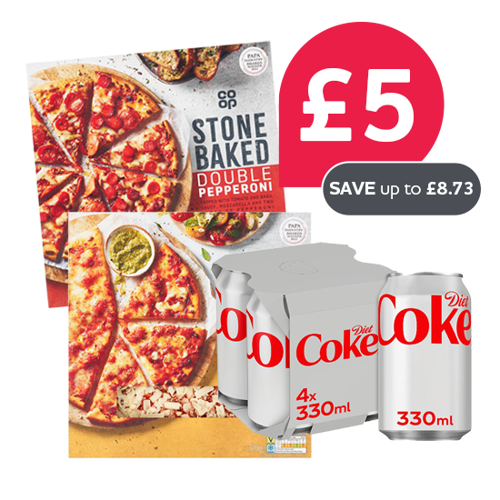 Co-op Stonebaked Pepperoni Pizza / Co-op Stonebaked Margherita / Co-op Stonebaked Meat Feast Pizza / Co-op Stonebaked Texan Bbq Chicken Pizza / Coke Zero 4pk / Coke Diet 4pk.